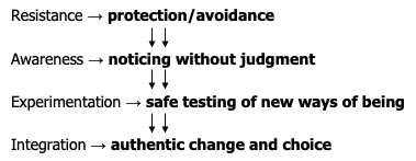 Lasting change comes not from forcing oneself to be different but from fully acknowledging and accepting one’s way of being which can be understood as the force of and power of “what is”. As an embodied and wholistic awareness of one’s way of being expands, resistance can soften, making space for greater ownership of one’s way of being which is what creates movement for more creativity and energy for new possibilities.